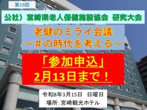 「第19回宮崎県老人保健施設大会」(令和8年3月15日、宮崎観光ホテル)は現在「大会参加」を募っています。