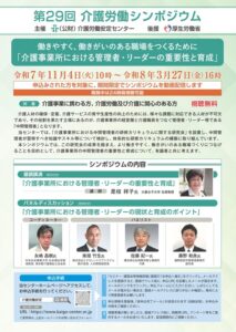 「働きやすく、働きがいのある職場をつくるために『介護事業所における管理者・リーダーの重要性と育成』」と銘打ったこのシンポジウムは介護事業に関わる方や、介護労働及び介護に関心のある方を対象に無料で視聴ができるもので、同センターが設置した「介護事業所における中間管理職の研修カリキュラムに関する研究会」の成果を踏まえ、より働きやすく、働きがいのある職場づくりにつなげる事を目的に、介護事業所の中間管理職の重要性と育成について、有識者と共に考える内容となっています。