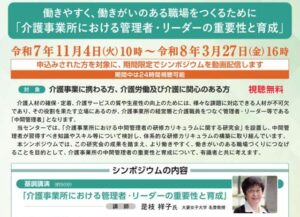 「働きやすく、働きがいのある職場をつくるために『介護事業所における管理者・リーダーの重要性と育成』」と銘打って開かれたこのシンポジウムの動画は介護事業に携わる方や介護労働及び介護に関心のある方を対象に令和8年3月27日(金)16時まで無料で視聴することができます。