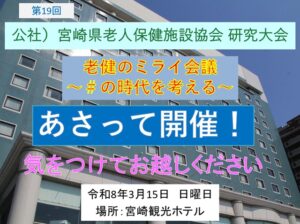 第19回宮崎県老人保健施設大会」は、あさって、令和8年3月15日、宮崎観光ホテルで開催するはこびとなりました。