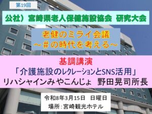 第19回宮崎県老人保健施設大会」(令和8年3月15日、宮崎観光ホテル)における基調講演のお知らせです。