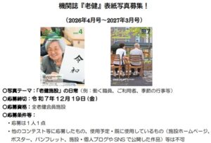 公益社団法人全国老人保健施設協会(全老健)では機関紙『老健』2026年4月号~2027年3月号の表紙写真を、会員施設から募集しています。