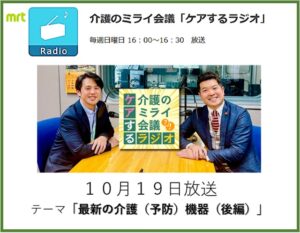当協会提供のMRTラジオ番組「介護のミライ会議『ケアするラジオ』」(毎週日曜日16時~16時30分)10月19日は16回目の放送。テーマは「最新の介護(予防)機器(後編)」です。