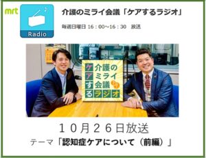 当協会提供のMRTラジオ番組「介護のミライ会議『ケアするラジオ』」(毎週日曜日16時~16時30分)10月26日は17回目の放送。テーマは「認知症ケアについて(前編)」です。