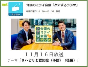 当協会提供のMRTラジオ番組「介護のミライ会議『ケアするラジオ』」(毎週日曜日16時~16時30分)11月16日は20回目の放送。テーマは「リハビリと認知症(予防)(後編)」です。