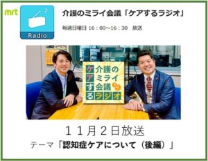 当協会提供のMRTラジオ番組「介護のミライ会議『ケアするラジオ』」(毎週日曜日16時~16時30分)11月2日は18回目の放送。テーマは「認知症ケアについて(後編)」です。