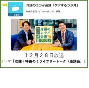 当協会提供のMRTラジオ番組「介護のミライ会議『ケアするラジオ』」(毎週日曜日16時~16時30分)12月28日は26回目の放送。テーマは「老健+特養のミライ フリートーク(座談会)」」です。