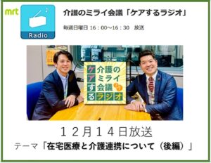 当協会提供のMRTラジオ番組「介護のミライ会議『ケアするラジオ』」(毎週日曜日16時~16時30分)12月14日は24回目の放送。テーマは「在宅医療と介護連携について(後編)」です。