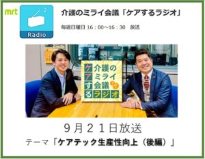 当協会提供のMRTラジオ番組「介護のミライ会議『ケアするラジオ』」(毎週日曜日16時~16時30分)、9月21日は12回目の放送。テーマは「ケアテック生産性向上(後編)」です。