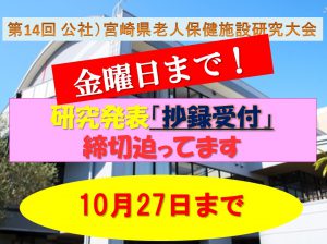 当協会主催の「第14回 公社)宮崎県老人保健施設研究大会」(12月23日、於JAアズムホール)の「抄録データ」の受け付けは今週金曜日(10月27日)までとなりました。
