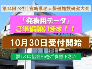 当協会主催の「第14回 公社)宮崎県老人保健施設研究大会」(12月23日、於JAアズムホール)の「発表用データ(パワーポイントファイル)」の受け付けを10月30(月)から開始します(11月20日まで)。