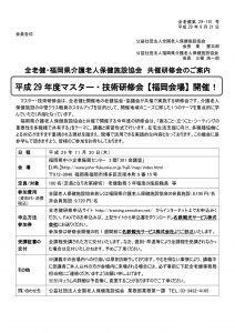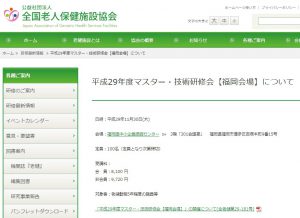 (公社)全国老人保健施設協会(全老健)と(公社)福岡県介護老人保健施設協会の共催による「平成29年度マスター・技術研修会【福岡会場】」が11月30日(木)福岡県中小企業振興センターで開催されます。対象は労研勤務5年程度の施設職員等。