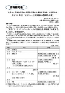 (公社)全国老人保健施設協会(全老健)と(公社)福岡県介護老人保健施設協会の共催による「平成29年度マスター・技術研修会【福岡会場】」が11月30日(木)福岡県中小企業振興センターで開催されます。対象は労研勤務5年程度の施設職員等。