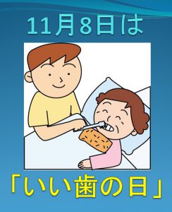 11月8日は「いい歯の日」。日本歯科医師会が平成5年に「い(1)い(1)歯(8)」の語呂合わせで制定しました。「『いつまでも美味しく、そして、楽しく食事をとるために、口の中の健康を保っていただきたい』という願いを込めて、厚生労働省とともに 1989年(平成元年)より『80歳になっても自分の歯を20本以上保とう』という『8020運動』を積極的に推進」している日本歯科医師会。「いい歯の日」は、その 「8020運動」推進の一環として、国民への歯科保健啓発の強化を目的として制定、この日に合わせて様々な啓発活動を行われています。