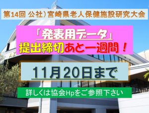 当協会主催の「第14回 公社)宮崎県老人保健施設研究大会」(12月23日、於JAアズムホール)の「発表用データ(パワーポイントファイル)」の提出締め切りは11月20日(月)までです。