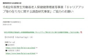 全老健ホームページに「令和2年度厚生労働省老人保健健康増進等事業『キャリアアップ等の在り方に関する調査研究事業』ご協力のお願い」が掲載されています。