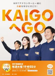 「MRTアナウンサーと一緒に介護を学びに行こう!」をコンセプトに、宮崎県が提供するレテレビ番組「KAIGOへGOシーズン6」は令和5年11月15日から令和6年1月まで、毎週水曜日19時55分からMRT宮崎放送にて放送中です。詳しくはこちらをご覧の上、ぜひご覧ください。