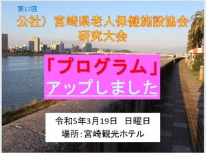 「第17回 公益社団法人 宮崎県老人保健施設協会 研究大会」(令和5年3月19日、宮崎観光ホテル)の大会プログラムをアップしました。