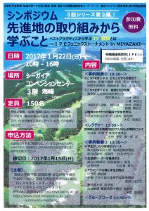 「先進地の取り組みから学ぶこと ベストプラクティスから学ぶコツ・裏技とは ~IPEフェニックストーナメント in MIYAZAKI~」と銘打ったこのシンポジウムは医療・保健・福祉にかかわる専門職、行政職員、養成校実習担当者、病院実習担当者、学生、住民活動を主体的に行っている方、その他関心がある方が対象。
